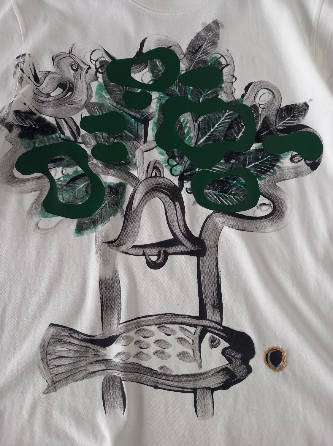10/of/10 Hand printed organic cotton T shirts created by Mandy McIntosh in 2024. This new limited edition work represents an on going use of the iconography of The Glasgow Coat of Arms as a draw on the city’s meaning and history held in the hands of the people. Individually Mono Printed with additional block print, hand drawing, colour and gold stitch embroidery. Additional vinyl applied to two. Small area of colour bleed to back plus finger prints=hand made.